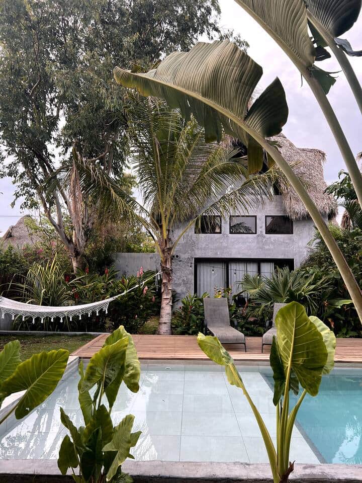 Primer nivel: Dos habitaciones independientes, cada una con una cama Queen, aire acondicionado y baño privado con ducha tipo abierta en la habitación. En la parte del frente de la casa hay un pequeño deck con hamaca y vista a la piscina.